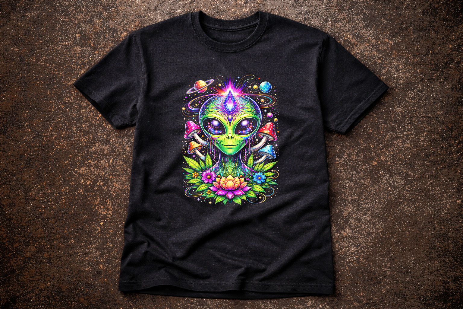 Born from the void and blooming with color, this design captures a cosmic being caught between dream and dimension. Its luminous gaze drips with starlight as planets orbit like silent guardians overhead. Psychedelic mushrooms rise from a radiant lotus, roots tangled in mysticism, rebirth, and forbidden knowledge. Electric hues cut sharply through the darkness, creating a vision that feels ritualistic and alive. Gothic in mood yet vividly transcendent, this shirt hums with otherworldly energy. It speaks to night wanderers, cosmic thinkers, and those drawn to the beautiful and strange—an emblem of curiosity, rebellion, and celestial communion.