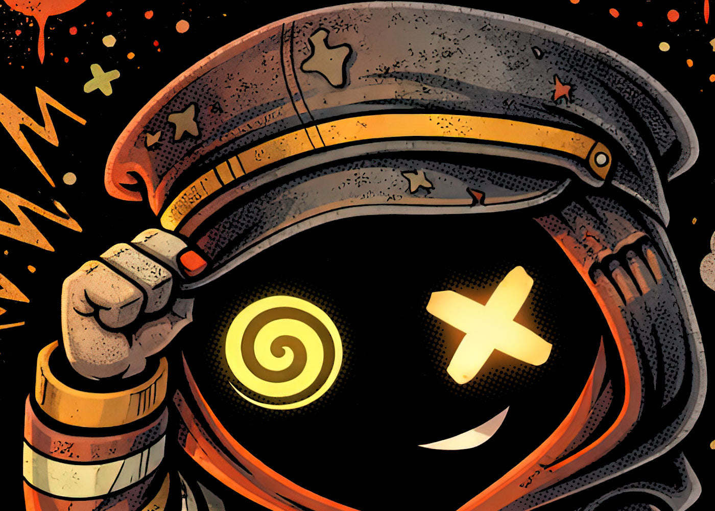 All aboard the Crazy Train—no brakes, no rules, no return. This graphic tee dives headfirst into beautifully controlled chaos, starring a manic cartoon conductor with spiraled eyes and X’d-out vision, marching straight toward nowhere. Burnt orange and grimy gold tones tear through deep black fabric, blending gothic humor with punk-fueled madness. It’s playful, dark, and slightly unhinged—perfect for outsiders, late-night thinkers, and anyone who wears their chaos proudly. Not just a shirt, but a warning sign: once you’re on this ride, there’s no getting off.