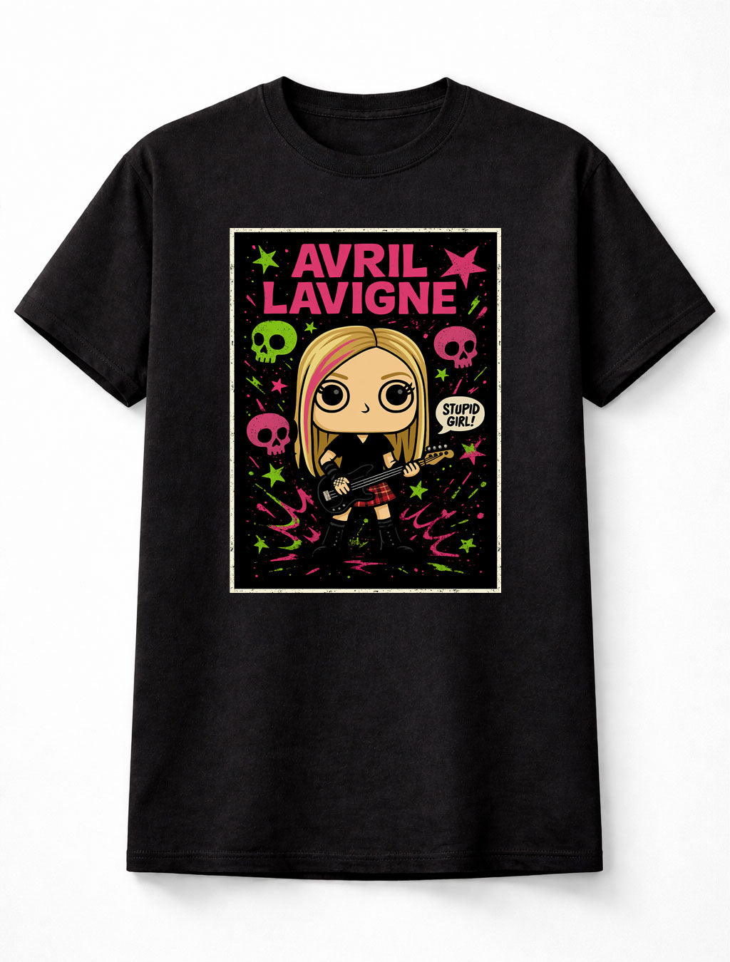Loud, rebellious and unapologetically bold — this Avril Lavigne graphic tee throws it straight back to the golden age of pop punk. Set against deep black cotton, neon pinks and electric greens explode around a comic-style Avril, guitar in hand and attitude locked in. Skulls, stars and splashes of colour give the design that fearless, skate-park energy fans know and love. Bold lettering crowns the look, while lyric nods spark instant nostalgia. Fun, fierce and packed with early-2000s edge, this tee captures the spirit of a generation that never wanted to be anything but themselves.