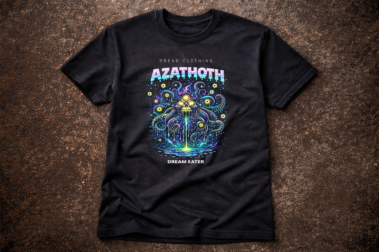 Born from the nuclear chaos beyond the stars, Azathoth rises in dripping colour and cosmic madness. This design pulses with toxic blues and sickly neon gold, tentacles writhing like living nightmares around a skull crowned with forbidden light. Eyes float in the void, watching, waiting, as reality melts into a glowing abyss beneath it. “Dream Eater” is not a warning—it’s a promise. The black fabric frames the horror perfectly, letting every psychedelic detail burn through the darkness. Gothic, surreal, and deeply unsettling, this tee feels like wearing a fragment of an elder god’s hallucination.