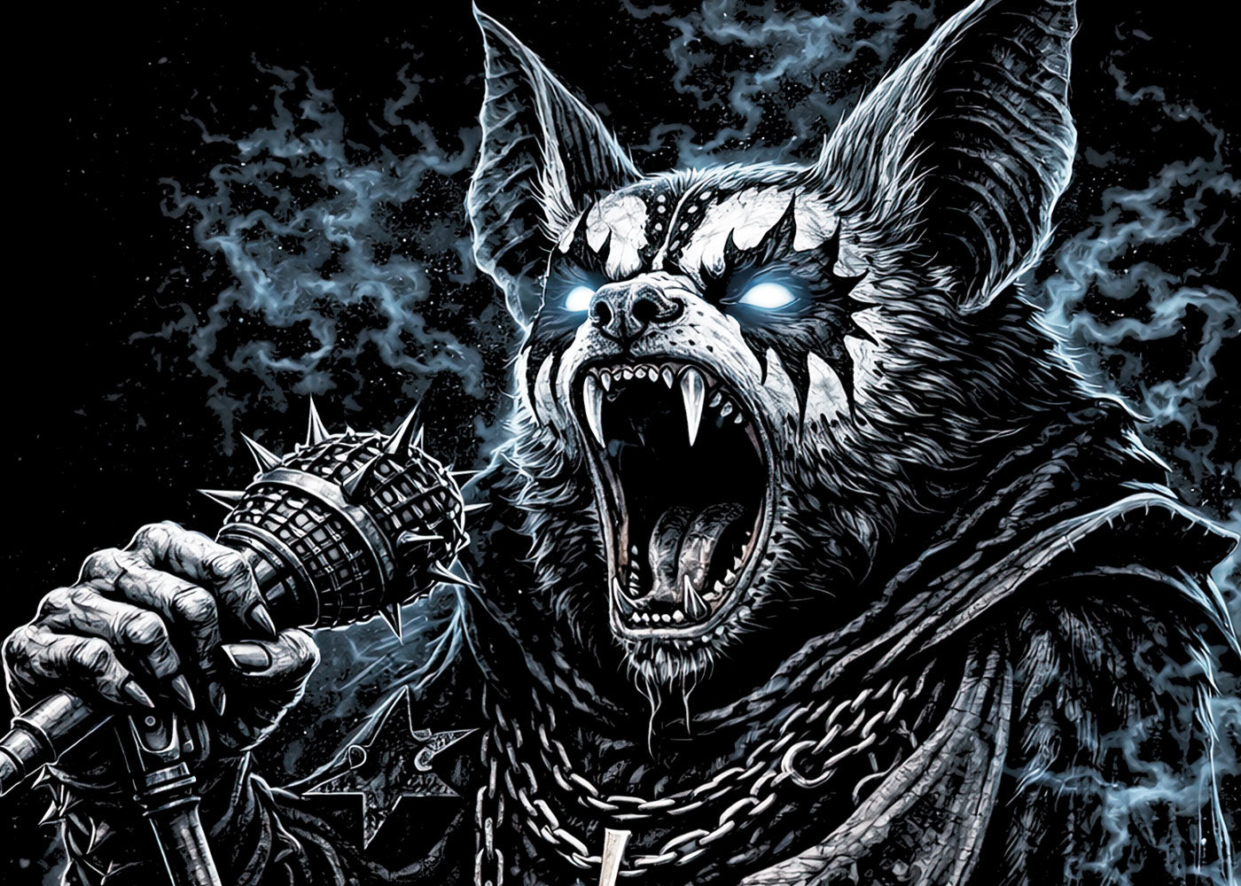 A feral vampire bat rocker screams into the void, captured mid-howl as an anthropomorphic bat vocalist gripping a microphone like a weapon. This gothic bat character merges nocturnal horror with raw heavy metal energy, its glowing eyes cutting through swirling electric mist. Part bat demon, part metal frontman, the design channels underground clubs, ritual stages, and midnight rebellion. Chains, dark robes, and crackling aura frame this dark fantasy animal musician, evoking gothic rock, black metal, and occult aesthetics. A striking fusion of bat art, vampire imagery, and rock music symbolism, made for those who live loud after sunset.