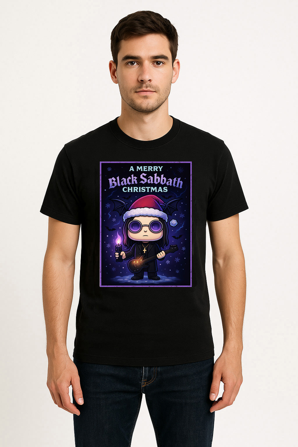 Celebrate the season with heavy riffs and dark cheer in this Black Sabbath Merry Christmas Unisex T-Shirt. Featuring a cartoon rock icon holding a candle and guitar against a gothic winter backdrop, this tee channels metal vibes with a festive twist. Made from 100% cotton, it’s the perfect shirt for rock fans who like their holidays heavy.
