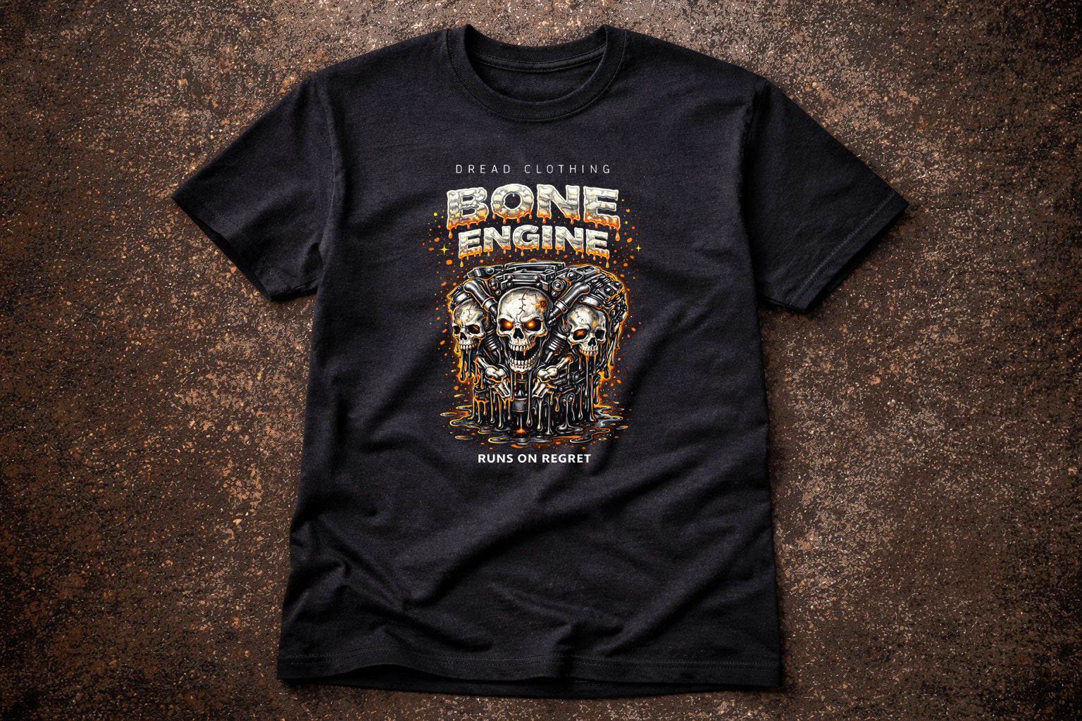 Forged in rust, fire, and bad decisions, the Bone Engine roars from the void. Three molten skulls fuse into a mechanical heart, pistons locked, jaws grinning through oil and ash. Heat bleeds from cracked metal as black sludge drips like spent fuel, every detail screaming excess and decay. “Runs on Regret” isn’t a joke—it’s the engine note of survival after midnight. The deep black fabric lets the ember-orange glow burn hot and relentless. Brutal, gothic, and unapologetically dark, this tee feels built for souls that never quite learned how to slow down.