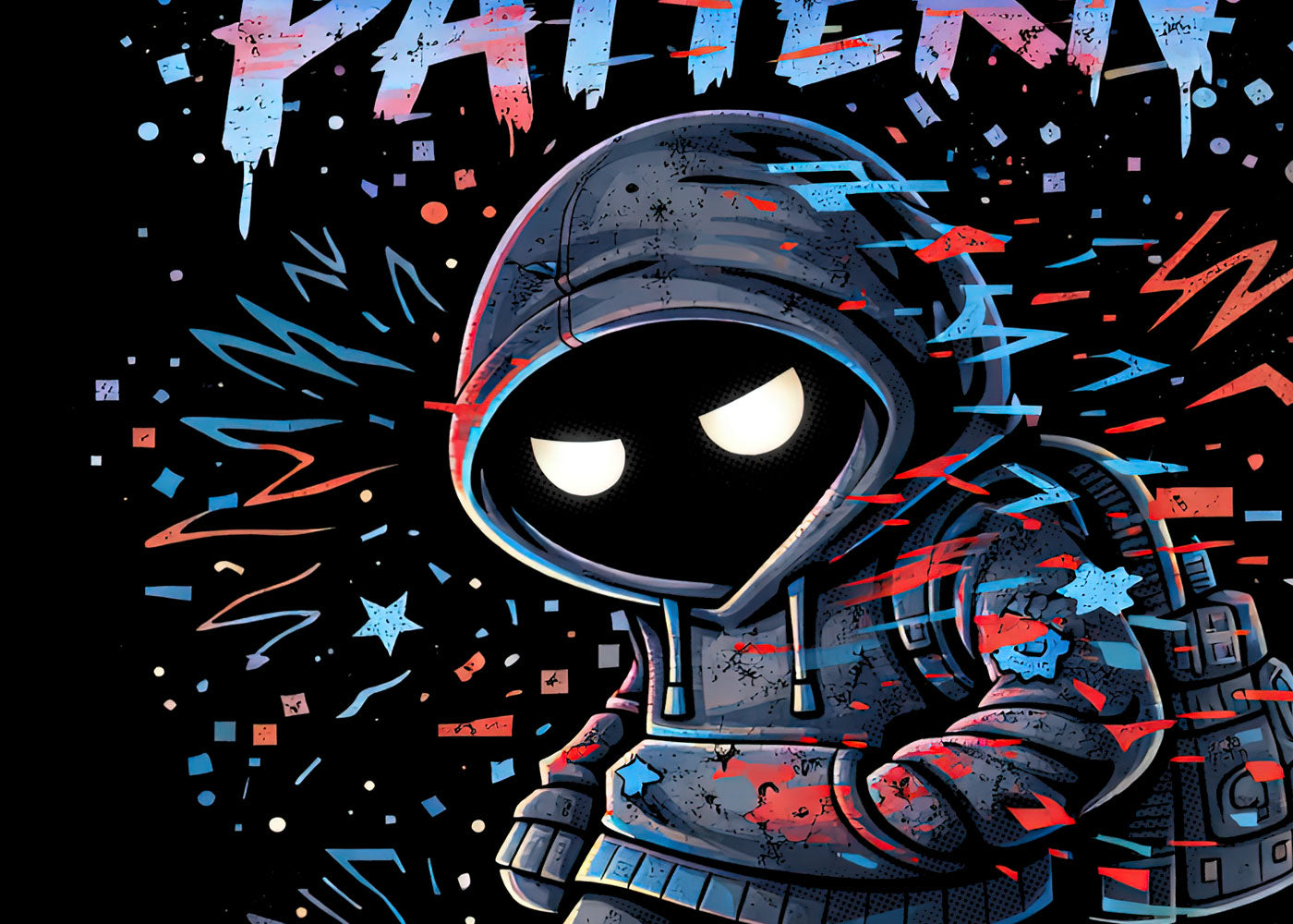 Break the pattern or be swallowed by it. This graphic tee captures defiance in motion—a hooded figure glitched with rebellion, eyes glowing against a storm of fractured lines and electric chaos. Bold neon blues and reds slash through black, giving the design a digital-anarchy edge with gothic attitude. It speaks to outsiders, system-breakers, and anyone who refuses to run on default settings. Dark, playful, and quietly confrontational, this shirt wears like a manifesto. Not programmed. Still growing. Built for those who evolve through the cracks and never apologize for it.