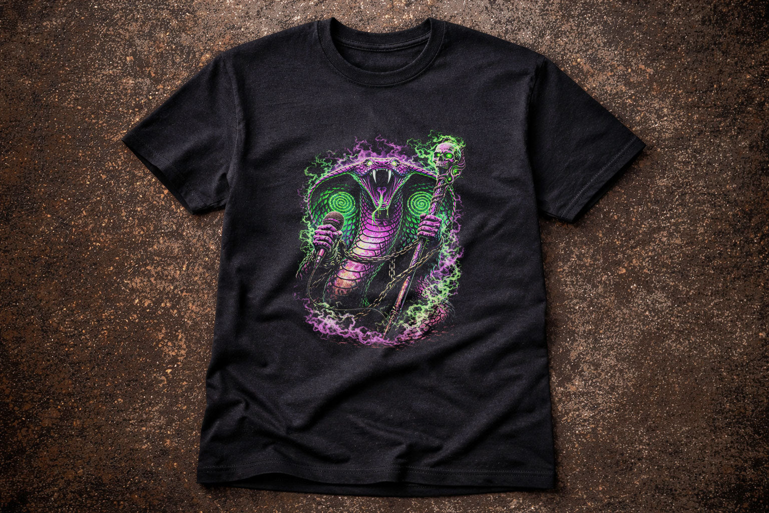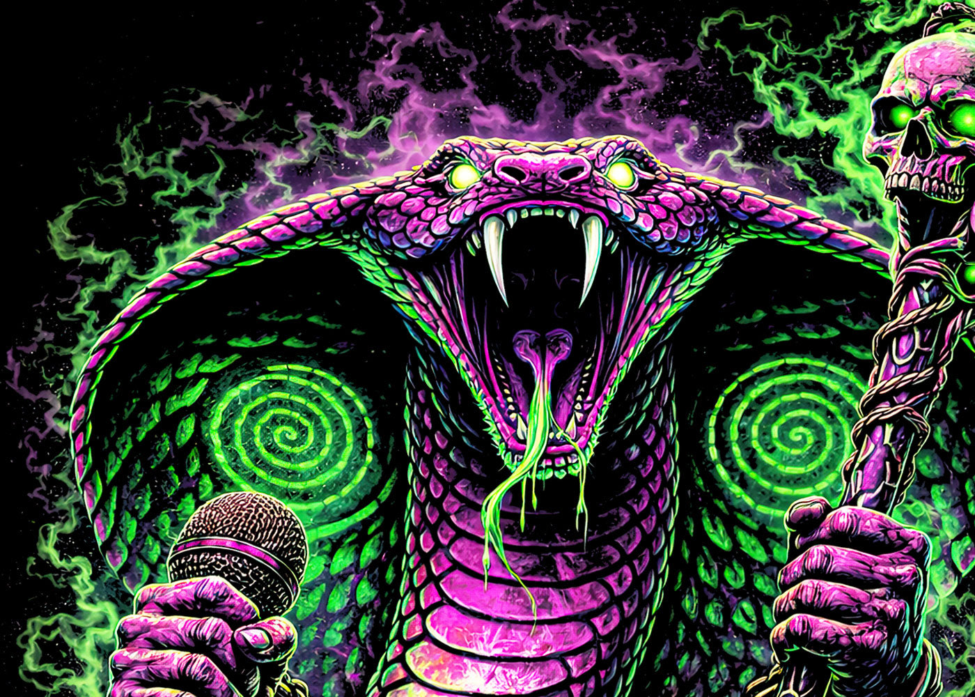 A venomous cobra rock singer coils at center stage, an anthropomorphic cobra serpent rising with hypnotic menace. This snake vocalist character grips a microphone like a spell, fangs bared as neon-green and purple energy spirals from its hooded gaze. Part poisonous cobra, part dark fantasy musician, it commands the crowd through rhythm and ritual, sound and sorcery. Chains, skulls, and toxic glow bind this demonic snake performer to occult rock mythology, where every hiss becomes a lyric and every note strikes like venom. A striking fusion of serpent symbolism, metal music art, and gothic intensity—made for those drawn to danger, power, and forbidden sound.