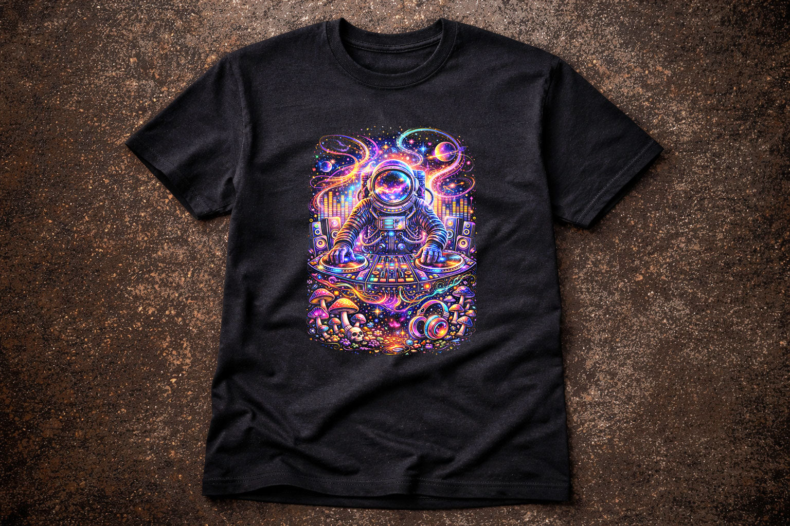 Drop the needle on the cosmos. This design reveals an astronaut DJ commanding the decks at the edge of reality, spinning soundwaves through nebulae and starlight. Galaxies swirl inside the visor, planets pulse to an unheard rhythm, and psychedelic mushrooms glow beneath like relics of an alien rave. Electric color fractures the darkness, blending space, music, and mysticism into a hypnotic spectacle. There’s a gothic undercurrent here—beautiful, chaotic, and slightly unhinged—where silence is shattered by cosmic basslines. This shirt feels alive with motion and rebellion, a visual anthem for night dwellers, star chasers, and those who dance far beyond Earth’s gravity.