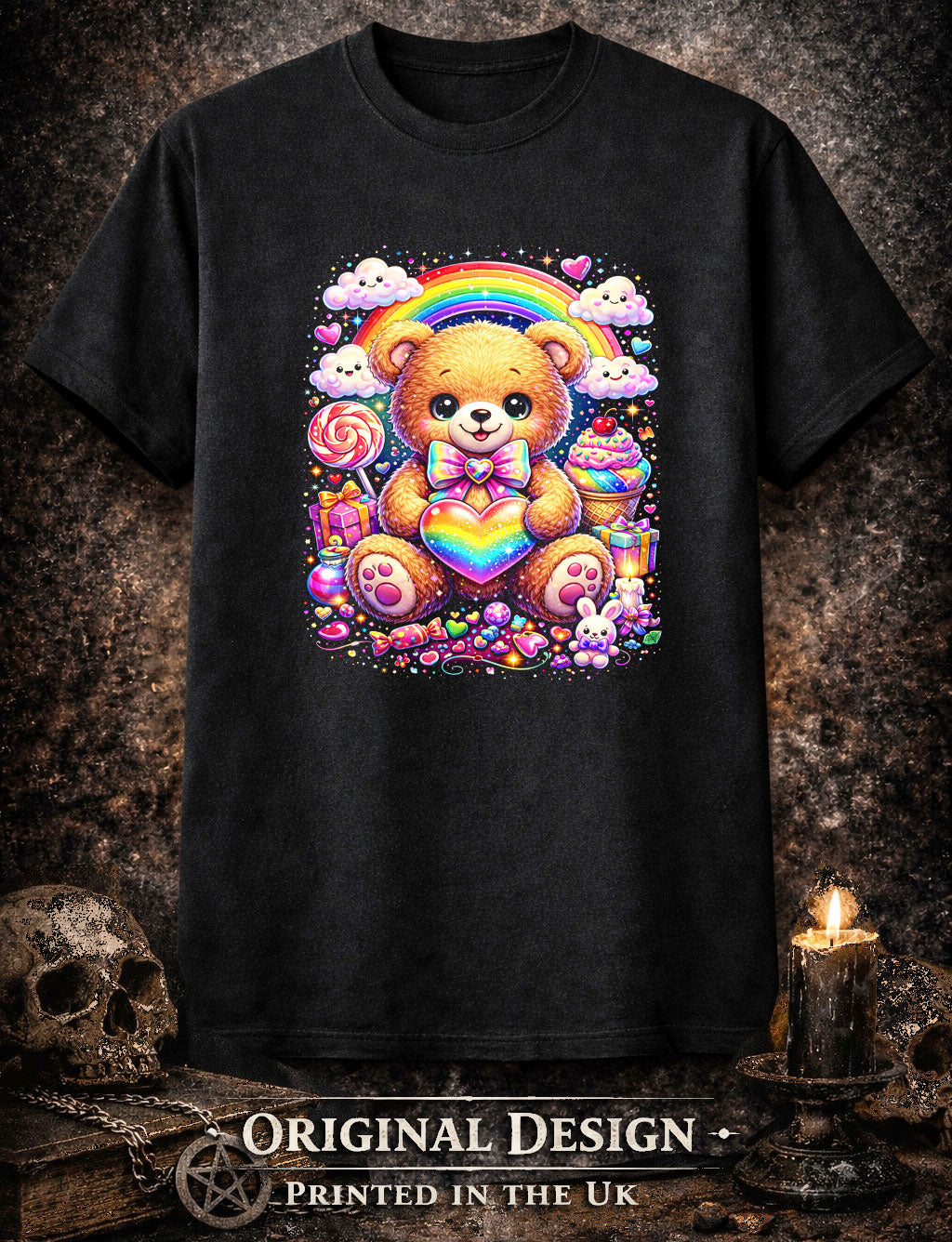 Sweetness turned surreal. This design radiates pure joy with a wide-eyed teddy bear cradling a glowing rainbow heart, surrounded by candy clouds, pastel dreams, and sugar-bright magic. Psychedelic color floods every detail, transforming childhood comfort into a trippy fantasy that feels almost hallucinogenic. Beneath the cuteness lies a subtle gothic contrast—innocence amplified to the edge of obsession, joy glowing a little too bright. It’s playful, bold, and unapologetically vibrant, designed to stand out against the dark. This shirt feels like a hug from another dimension, made for those who love sweetness with a strange twist and aren’t afraid to wear happiness loud.