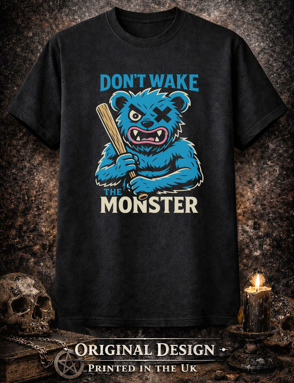 This graphic T-shirt features an angry cartoon bear monster character gripping a bat, paired with the bold warning text “Don’t Wake The Monster.” The design uses strong outlines and vibrant blue tones to give the character an intense but playful, comic-style look.