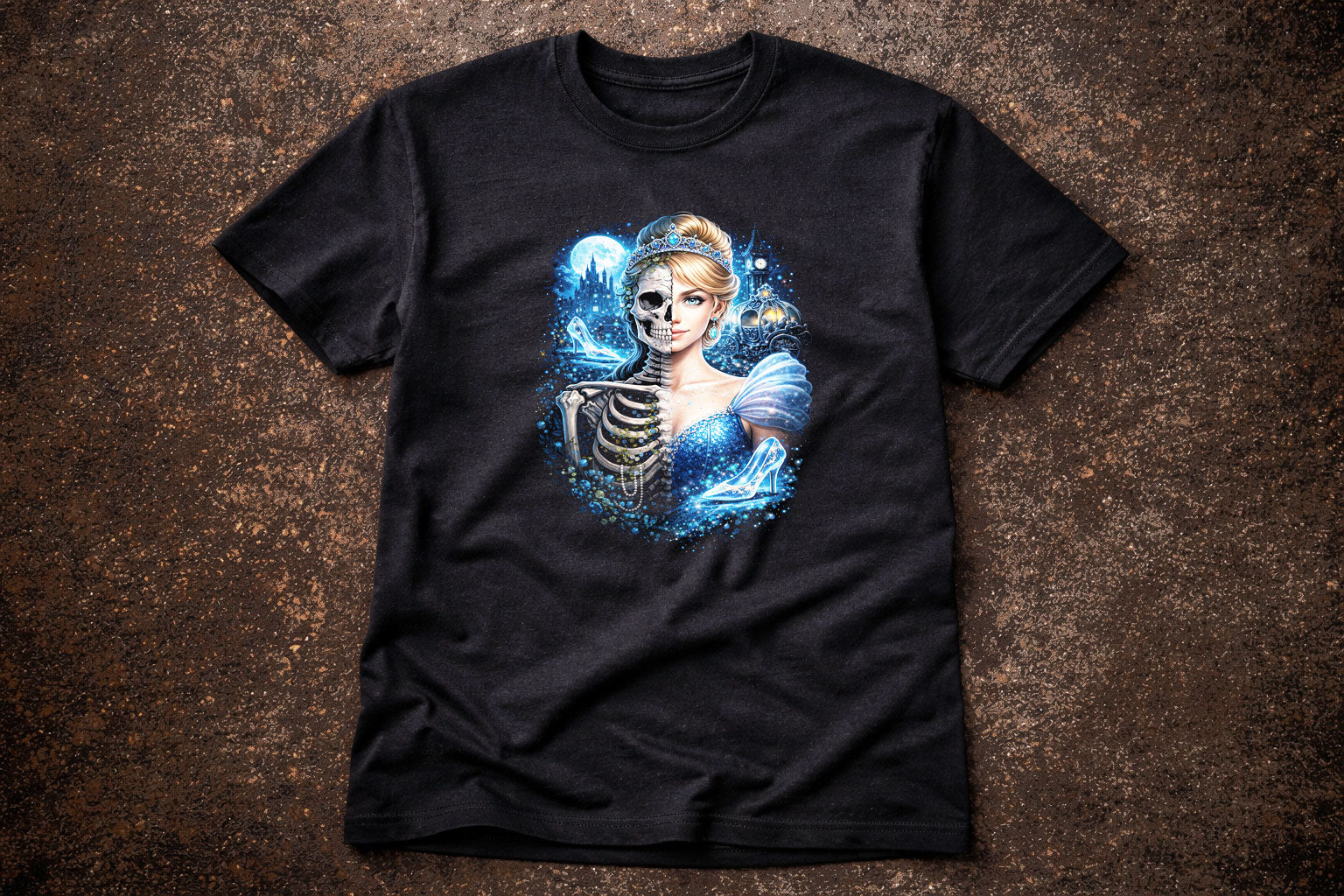 This gothic fairy tale T-shirt reimagines Cinderella with a dark fantasy twist. The detailed artwork features a split design combining an elegant princess and a skeletal half, set against a moonlit castle backdrop with glass slippers and enchanted carriage details. Rich blue tones and glowing highlights create a striking contrast on black fabric, giving the design depth and atmosphere. Perfect for fans of gothic fashion, fairy tales with an edge, skull art, and fantasy aesthetics. This unisex graphic tee is ideal for everyday wear, conventions, festivals, or as a unique gift for lovers of dark storybook art. Bold, dramatic, and made to stand out.