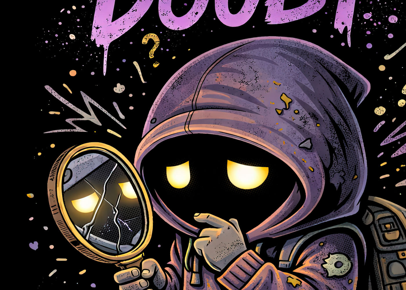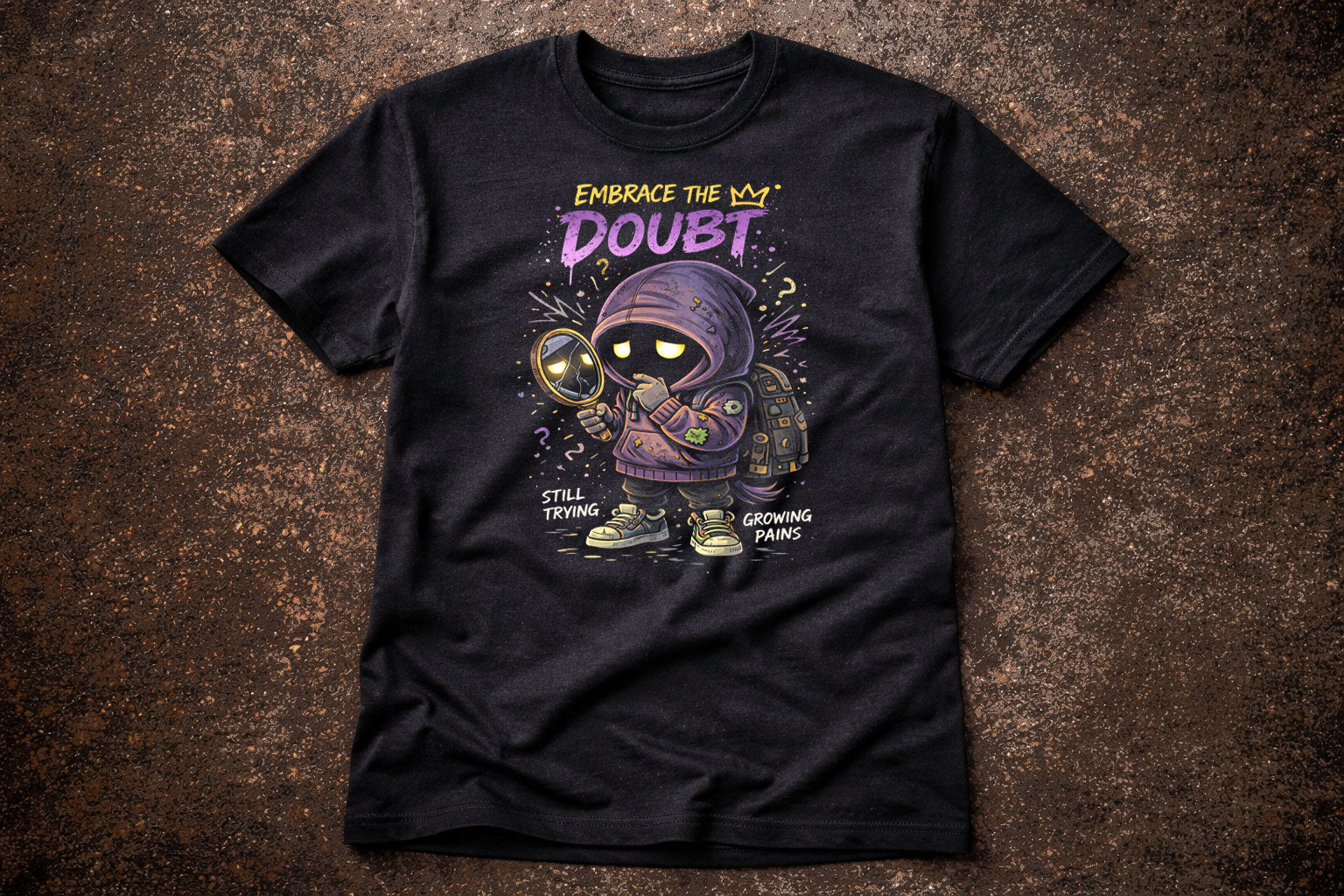 Embrace the doubt—it means you’re still thinking, still trying, still becoming. This graphic tee captures quiet uncertainty with a darkly cute twist: a hooded figure studying cracked reflections, glowing eyes heavy with questions. Soft purples and muted golds glow against black, blending gothic mood with thoughtful rebellion. It’s introspective without being weak, vulnerable without losing edge. Made for overthinkers, late bloomers, and anyone growing through the cracks. This shirt doesn’t promise answers—it honors the process. Doubt isn’t failure here, it’s proof of motion. Wear it as a reminder that growth is messy, and that’s the point.