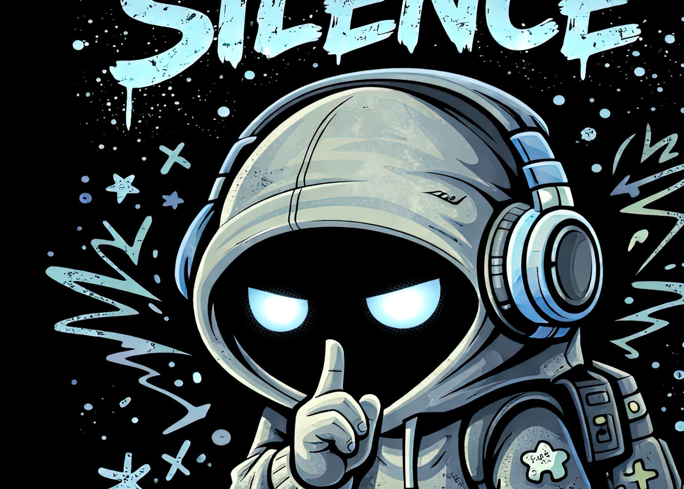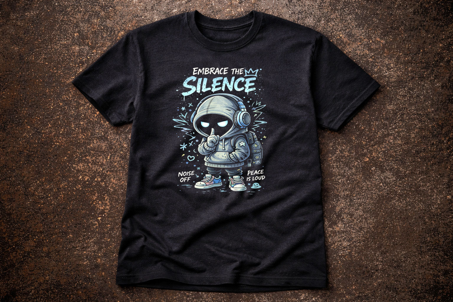 Embrace the silence—where the noise fades and clarity hits hardest. This graphic tee captures quiet rebellion with a hooded figure, finger to lips, eyes glowing beneath oversized headphones. Cool icy blues and muted tones cut clean through black, giving it a calm-but-deadly gothic edge. It’s for introverts, night walkers, and anyone who finds strength in stillness. Soft-spoken yet powerful, this design whispers louder than chaos ever could. Wear it as armor against the world’s static. Noise off. Peace is loud.