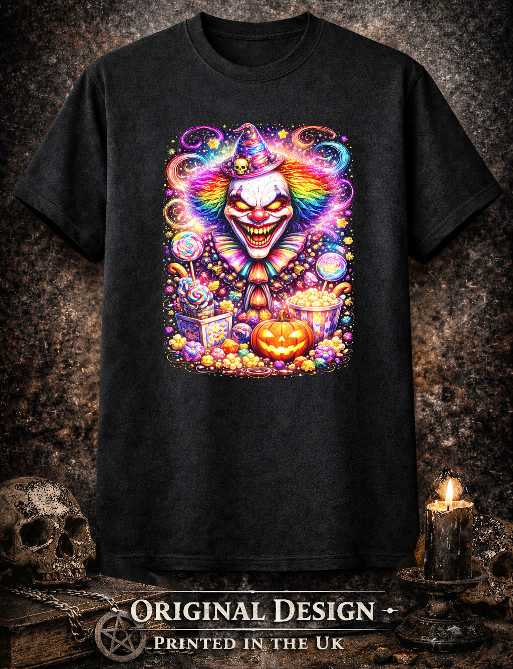 Laughs echo where innocence dies. This design unleashes a nightmarish clown grinning through chaos, eyes blazing with manic delight and cosmic madness. Candy and carnival relics twist into something sinister as neon color detonates against the dark, turning childhood joy into a psychedelic fever dream. There’s a gothic menace woven into every detail—playful, grotesque, and irresistibly unhinged. Swirling lights, jack-o’-lantern glow, and warped smiles collide in a vision that feels cursed yet magnetic. This shirt doesn’t whisper; it cackles. A perfect emblem for those who embrace horror with humor, beauty with terror, and aren’t afraid to wear their darkness loud.