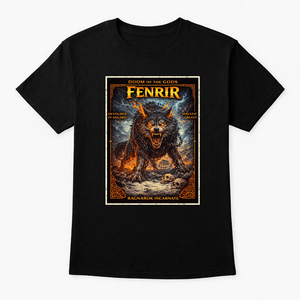 This epic Fenrir Wolf card-style t-shirt showcases the legendary beast of Norse mythology in a dramatic Gothic fantasy illustration. Printed on a comfortable unisex tee, it features fiery tones, rune details and a mythic trading-card aesthetic that truly stands out. Perfect for Viking fans, mythology collectors, gamers, pagan symbolism enthusiasts and lovers of dark fantasy art. Great for casual wear, festivals, gigs or alternative streetwear styling. A fantastic gift for anyone who appreciates Nordic legend and fierce mythical creatures. Add powerful Ragnarok energy to your wardrobe with this striking Fenrir design inspired by ancient myth and epic fantasy.