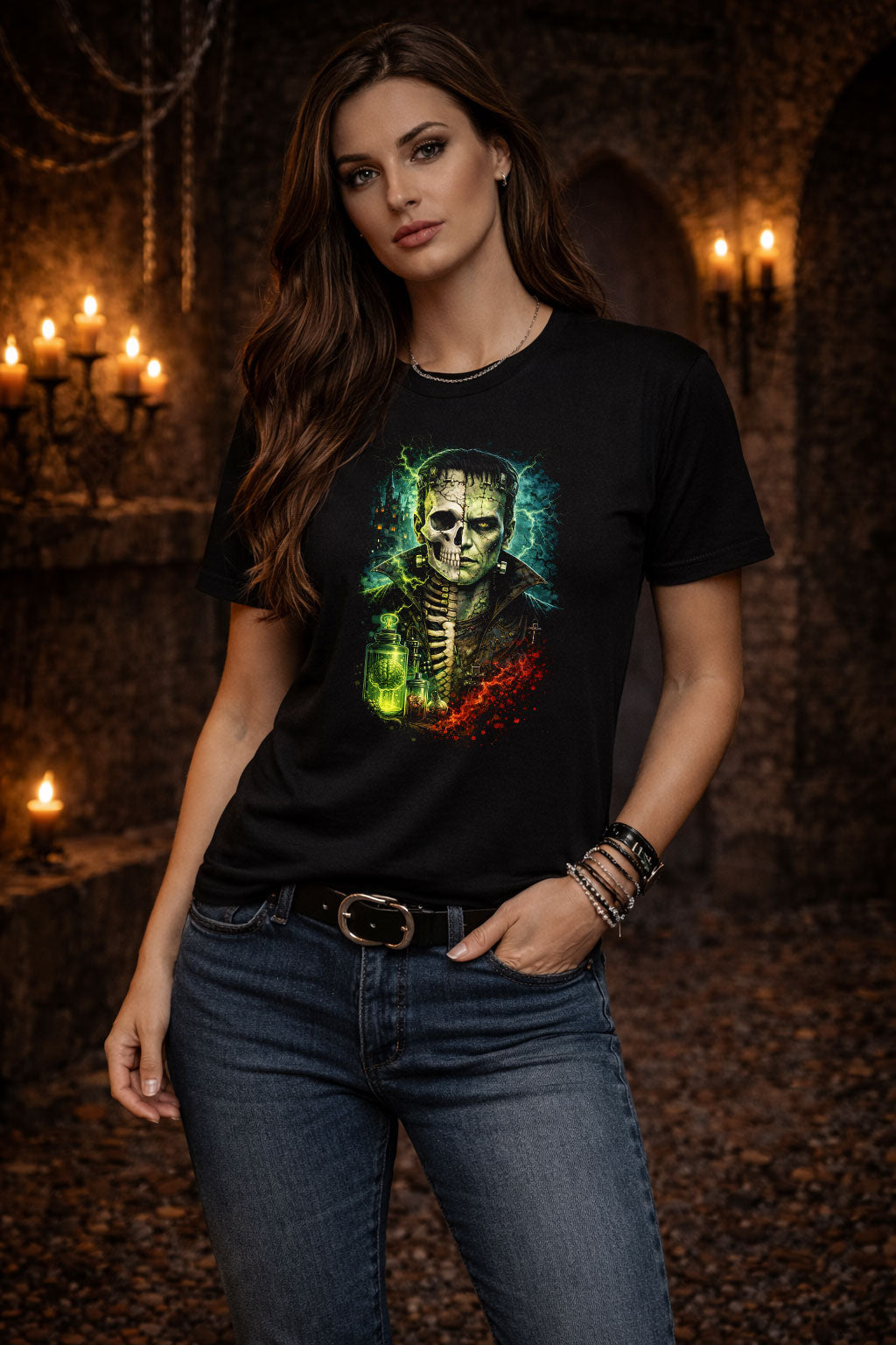 Frankenstein Skeleton Skull Unisex Graphic T-Shirt Mad Science Horror Art Tee