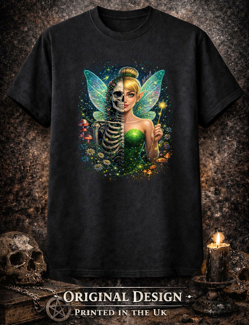 This gothic fantasy T-shirt features a dark fairy reimagining with a bold split-face design. One side reveals a detailed skeleton entwined with flowers and vines, while the other shows a glowing forest pixie with shimmering wings and a magical wand. Rich green tones, sparkling highlights, mushrooms, and woodland details give the artwork a vivid enchanted feel against the black fabric. The contrast between beauty and decay creates a striking, eye-catching design. Perfect for fans of dark fairy tales, gothic art, fantasy illustration, and alternative fashion. A unisex graphic tee that stands out at festivals, gigs, or everyday wear.