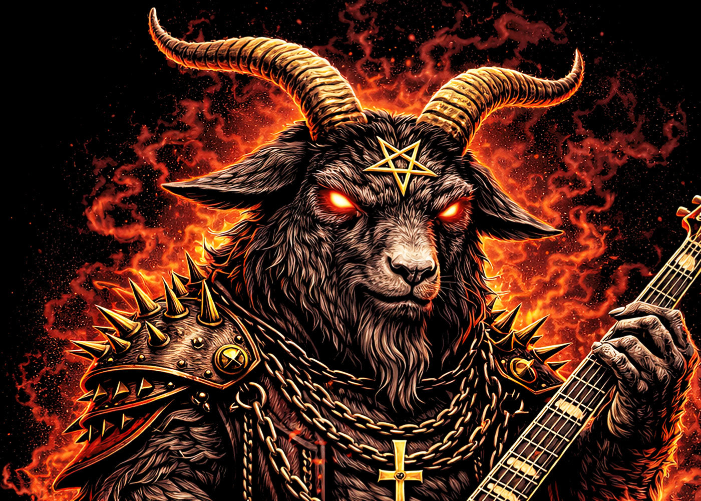 A hell-forged metal goat guitarist stands blazing in infernal light, an anthropomorphic goat demon wielding a razor-edged electric guitar like a sacrificial blade. Horns crowned with occult symbols, eyes burning red, this satanic goat musician channels raw riffs through fire and fury. Leather, spikes, and pentagrams fuse beast and blasphemy, forging a true black metal goat character born of ritual and rebellion. Every chord feels summoned, every note a challenge to the heavens. This design embodies demonic goat art, heavy metal mythology, and dark occult energy — a vision of pure distortion, perfect for those who live loud and bow to no gods.