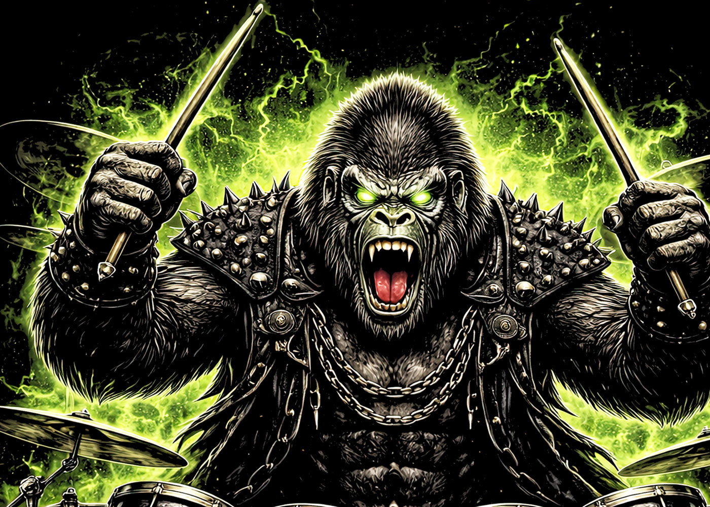 A feral gorilla drummer erupts in a storm of sound and fury, an anthropomorphic ape musician hammering the drums like a ritual of war. This metal rock gorilla roars from behind a skull-marked drum kit, leather and spikes bristling as neon-green energy coils around every strike. Part primal beast, part heavy metal percussionist, it embodies raw rhythm and untamed power. Muscles tense, eyes blazing, this drumming gorilla character feels summoned from a hell-lit stage where instinct rules and volume is law. A savage fusion of animal metal art, gothic aggression, and thunderous rebellion, made for those who worship rhythm and rage.