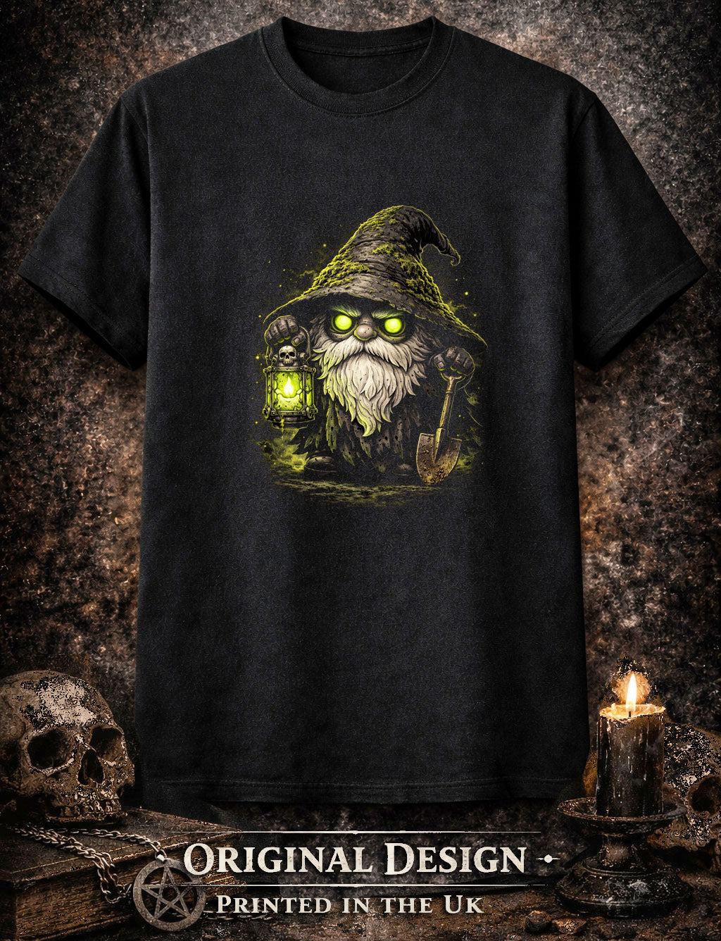 A sinister gravedigger gnome stalks the shadows, lantern glowing sickly green as it illuminates fresh earth and old bones. With one hand clutching a shovel and the other a skull-lit lantern, this dark fantasy gnome feels like a guardian of forgotten graves—ancient, patient, and unafraid of the dead. His glowing eyes burn through the gloom, beard tangled with moss and soil, as if he’s crawled straight from the cemetery itself. Blending gothic folklore, eerie woodland magic, and graveyard menace, this design captures the quiet terror of a night-watch gnome, keeper of secrets buried deep beneath the soil.