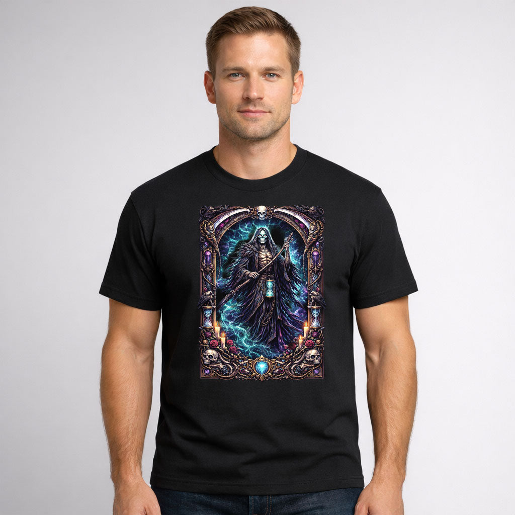 The Grim Reaper stands cloaked in shadow, holding a scythe and glowing hourglass as stormy blue energy swirls around him. Ravens, skulls, candles, and ornate gothic elements frame the scene, symbolizing fate, time, and the inevitable passage of life. Powerful and haunting, the design blends mythology, darkness, and mysticism with striking visual detail. This Unisex tee is perfect for fans of macabre fantasy art, gothic symbolism, and death-themed aesthetics. Dramatic, intense, and unforgettable, it’s a bold statement piece for anyone fascinated by the mysterious edges of existence and the timeless figure who waits at the end of the journey.