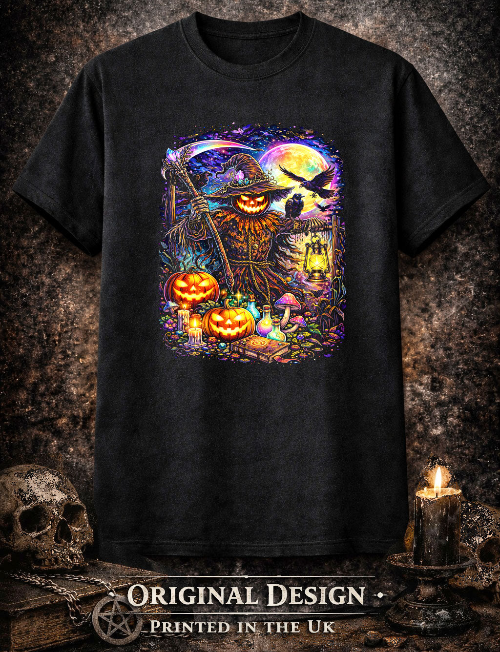 A grin stitched from moonlight and menace. This design summons a cursed scarecrow standing guard beneath a swollen harvest moon, its jack-o’-lantern smile glowing with sinister intent. Ravens wheel through the sky as candles flicker, potions bubble, and mushrooms creep from haunted soil. Psychedelic color ignites the darkness, twisting autumn folklore into a vivid fever dream. There’s a deep gothic pulse here—ritualistic, eerie, and alive with old magic. Equal parts Halloween nightmare and enchanted vision, this shirt feels like a spell cast at midnight, made for those who thrive in the shadows of October and carry the season of darkness year-round.