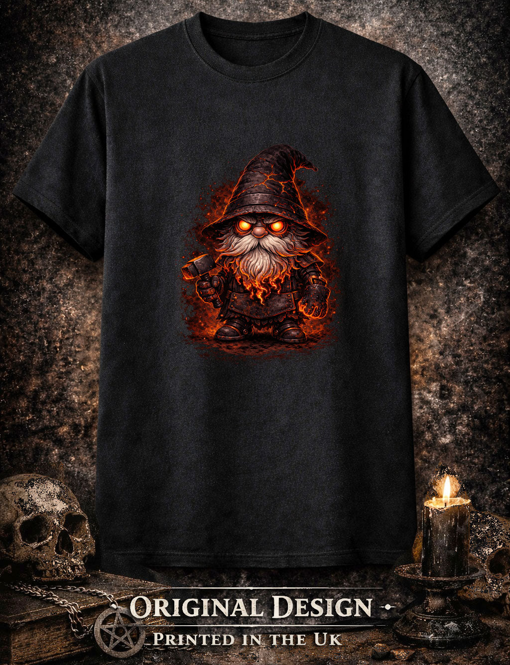 This design features a hellforge gnome, a fiery blacksmith gnome character born from molten metal and infernal flames. With glowing ember eyes, a scorched leather hat, and a heavy forge hammer clenched in his hand, this fire gnome embodies the spirit of an infernal craftsman working deep within a hellish forge. Cracks of lava glow through his armor and beard, blending fantasy gnome folklore with dark metal aesthetics. A powerful demonic gnome blacksmith design perfect for fans of fantasy art, fire-forged characters, dark gnome artwork, and heavy metal–inspired fantasy imagery.