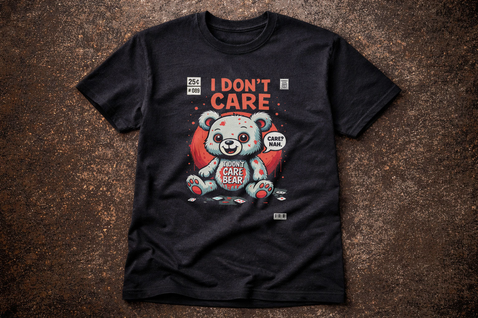 This graphic T-shirt features a dark humour parody teddy bear character with a cute-but-creepy style and a bold “I Don’t Care” attitude. Designed with a distressed comic-book aesthetic, the artwork contrasts an adorable plush bear look with sarcastic, horror-inspired humour for maximum impact.