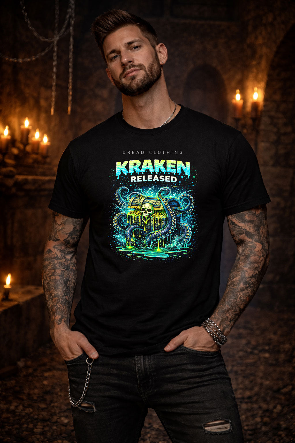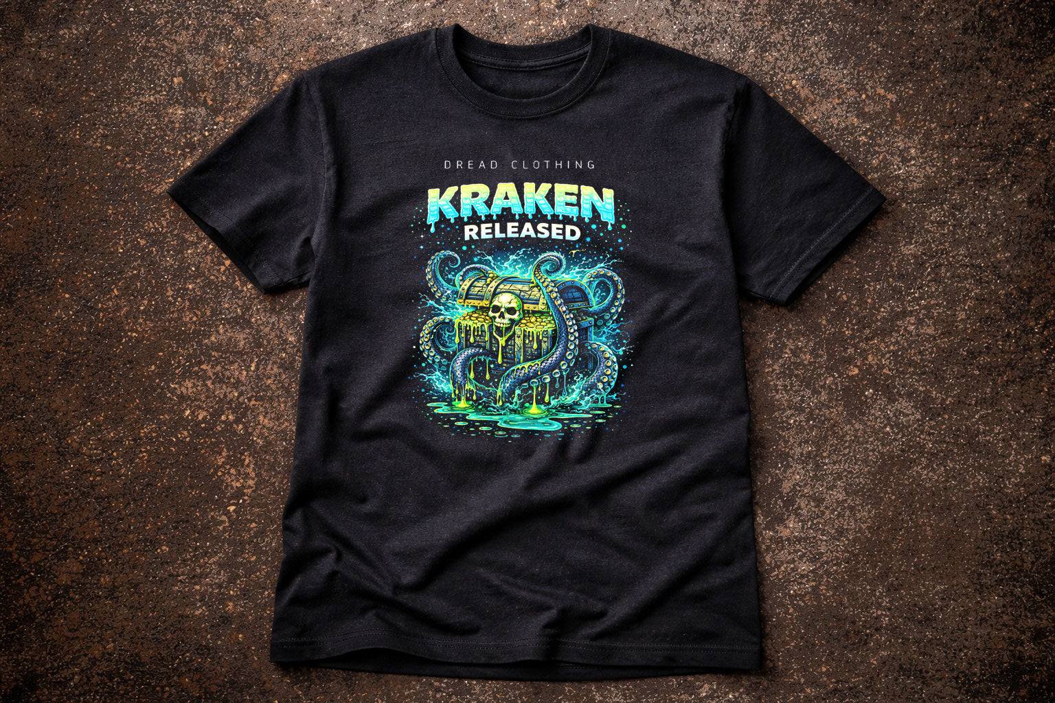 Command the deep where light dies. This Kraken Captain design summons a drowned ruler from blackened seas—a skull-faced corsair crowned in rot, eyes glowing with abyssal fire. Tentacles coil and writhe like living curses, dripping bioluminescent poison into churning waters below. Every detail feels soaked in salt, death, and ancient hunger, as if the ocean itself chose a king. The black fabric becomes open water at midnight, letting toxic greens and spectral blues burn through the dark. Gothic, feral, and steeped in nautical dread, this tee wears like a curse carried ashore—claimed by the sea, loyal to nothing else.