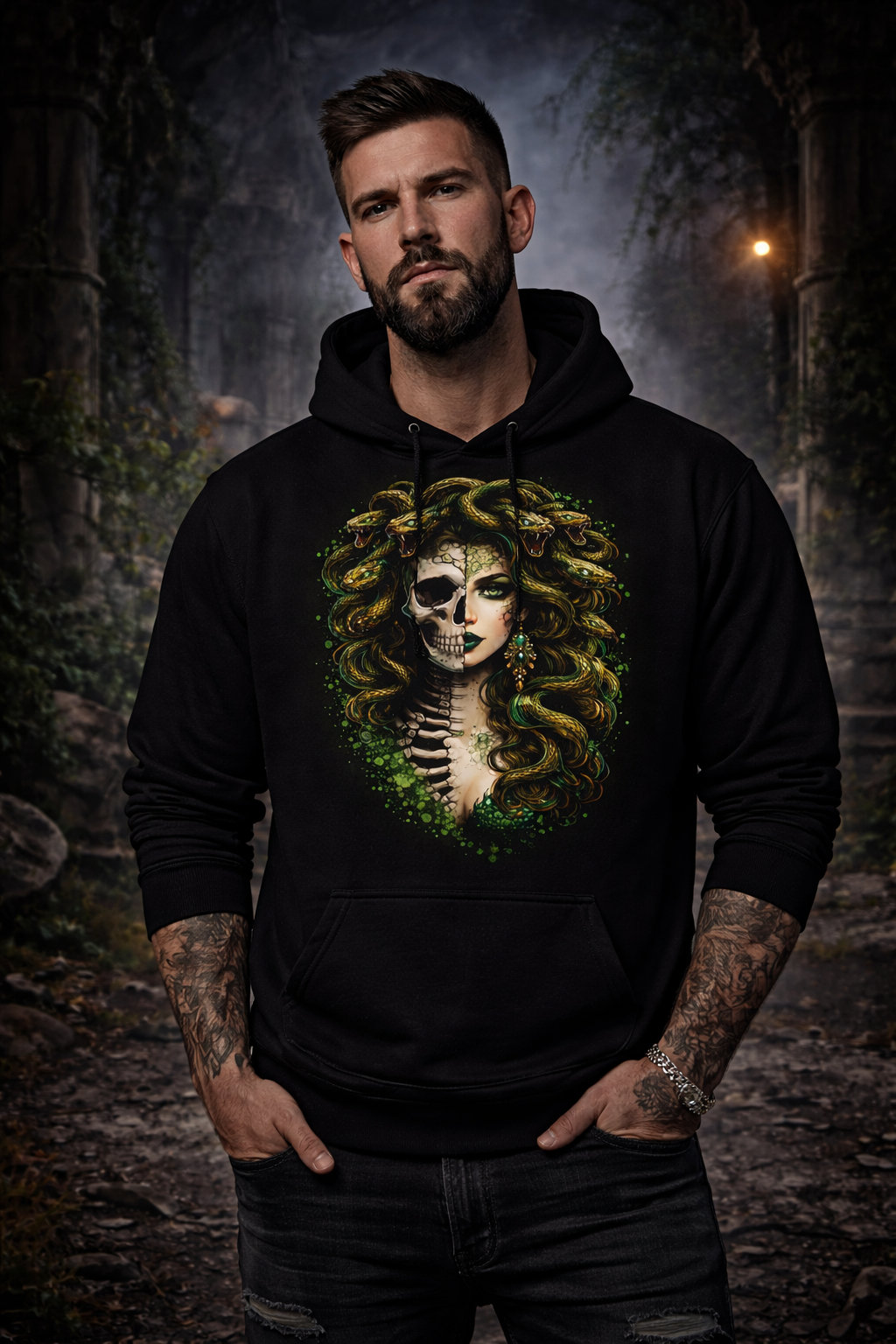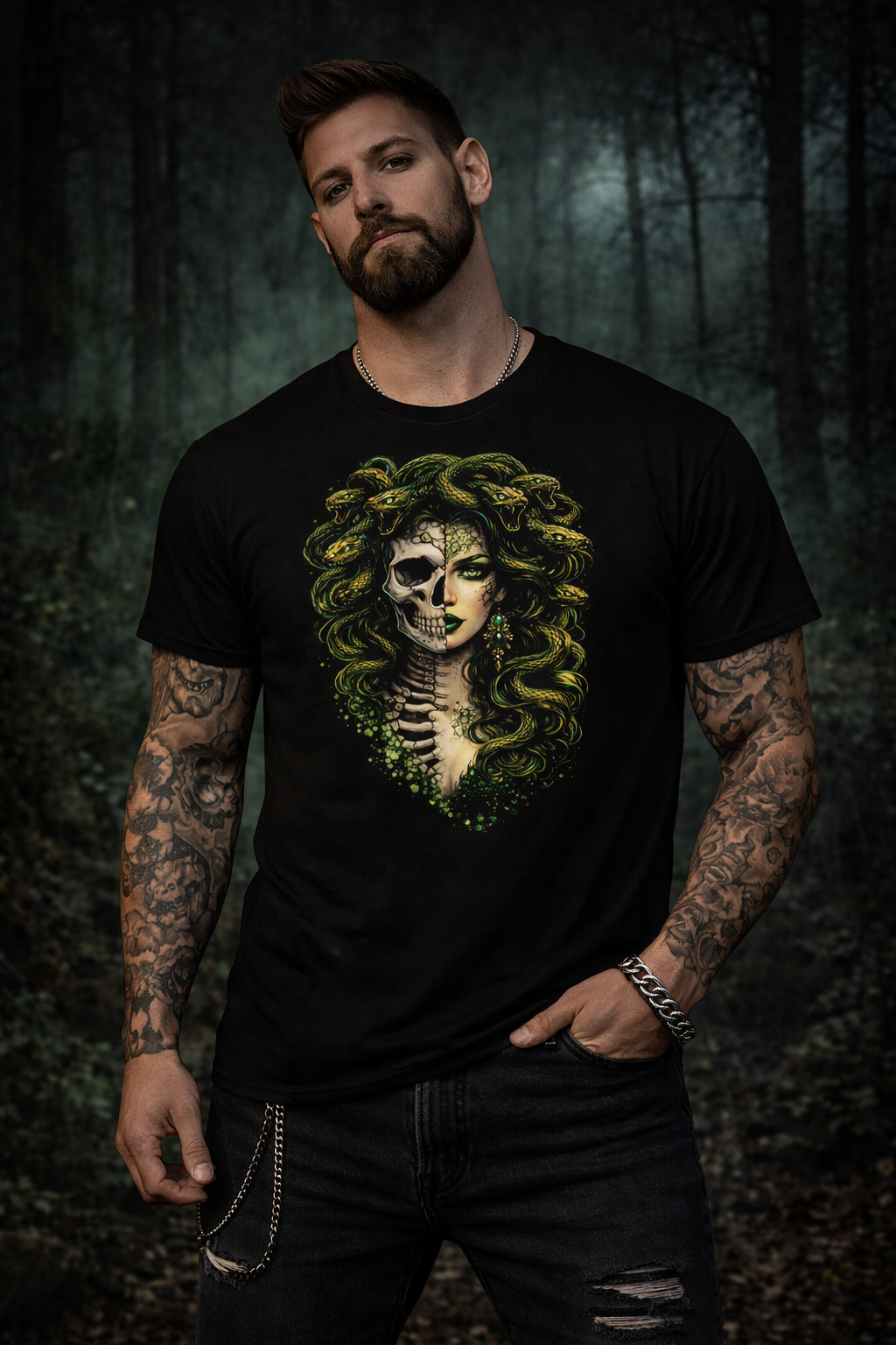 This design reimagines Medusa as both myth and memento mori, her face divided between living beauty and exposed bone. One eye still burns with ancient intelligence, the other hollow and timeless, a reminder of what power costs. Serpents coil through her hair in slow, deliberate motion, not striking, not fleeing—watching. Their scales gleam like old poison and polished emeralds, alive with quiet threat.
