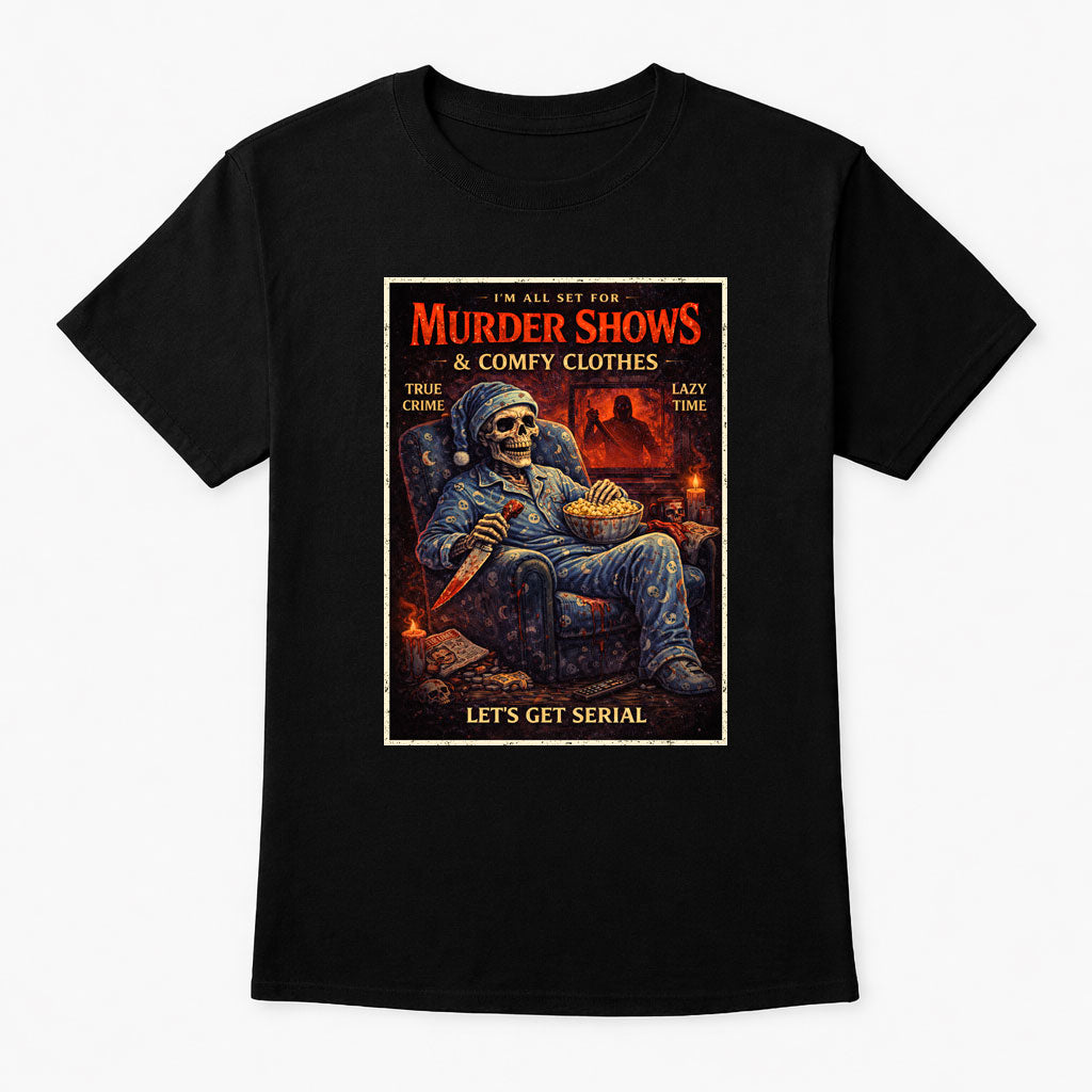 Murder Shows Skeleton T Shirt Unisex Gothic True Crime Dark Humour Tee
