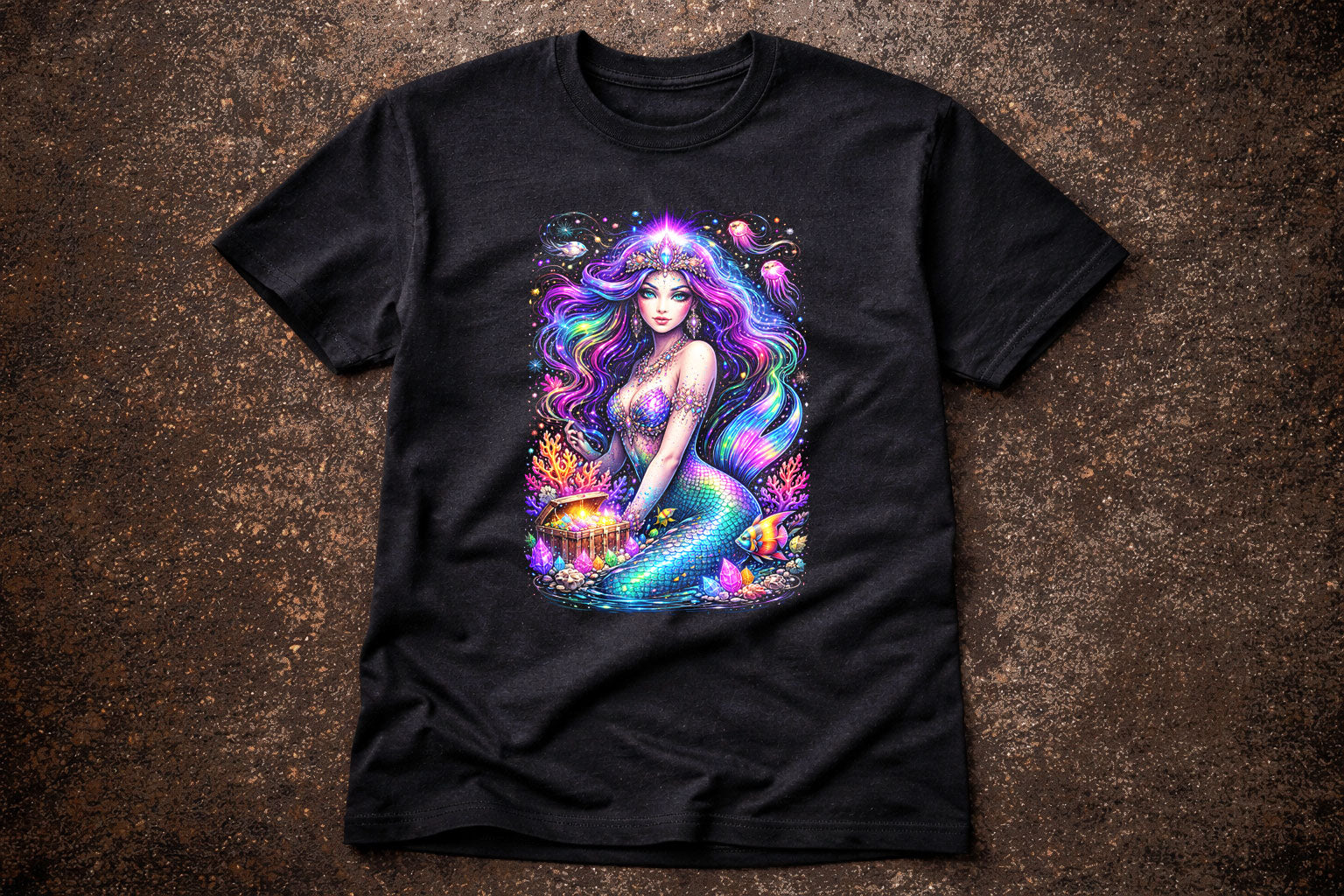 Drawn from the abyss where beauty and danger entwine, this design unveils a siren of the deep crowned in starlight and color. Her iridescent scales shimmer with psychedelic fire as jeweled hair flows like a living tide. Crystals glow, coral twists, and a treasure chest gleams with forbidden promise beneath her gaze. There’s a gothic allure beneath the radiance—ancient, seductive, and quietly ominous. This is ocean myth turned fever dream, a vision that feels enchanted and untamed. Worn boldly, it becomes a sigil for those drawn to the deep, the strange, and the spellbinding pull of dark fantasy.