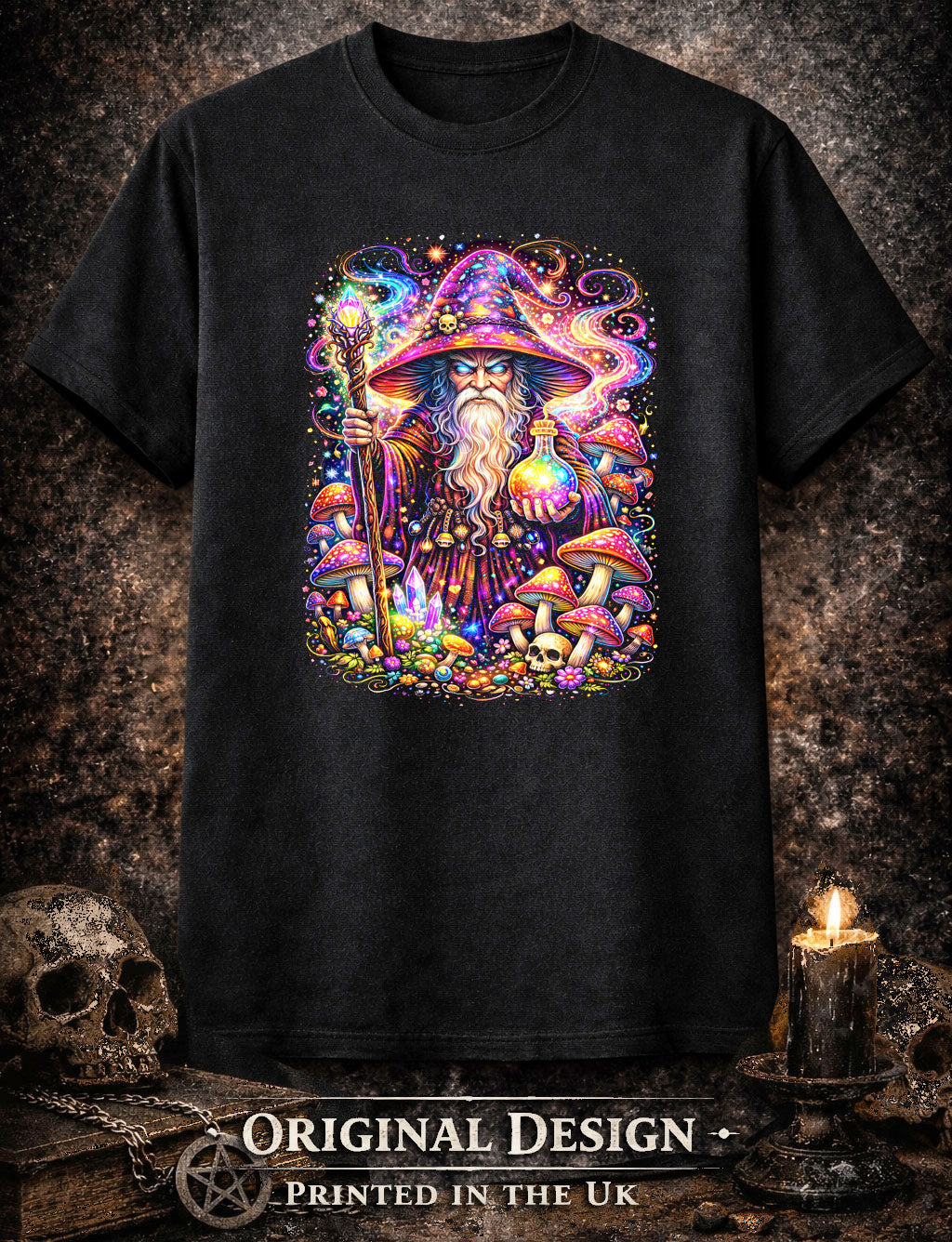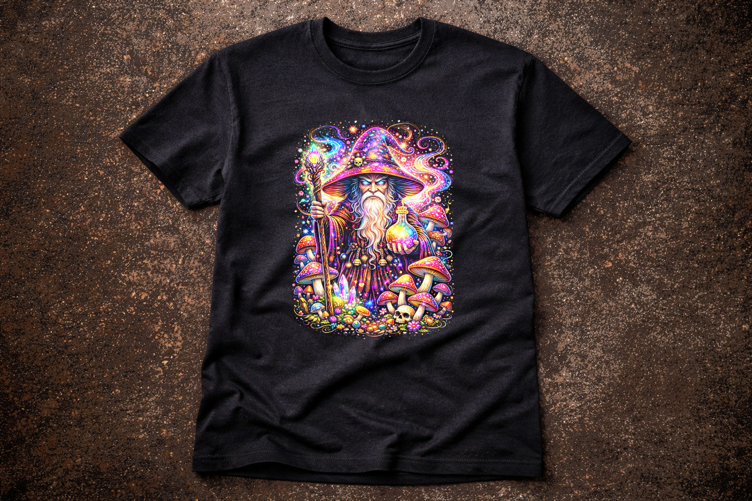 An ancient spellcaster steps from the undergrowth, eyes glowing with knowledge earned across centuries. This design captures a cosmic wizard clutching a radiant potion, staff humming with arcane power as psychedelic mushrooms bloom at his feet. Neon magic coils through the darkness, illuminating crystals, skulls, and symbols of forgotten rites. There’s a deep gothic weight to the scene—wise, ominous, and beautifully unhinged—where fantasy feels dangerously real. Every color pulses like a living incantation, turning myth into motion. This shirt feels like wearing a fragment of forbidden lore, crafted for seekers of magic, altered states, and worlds hidden just beyond the veil.