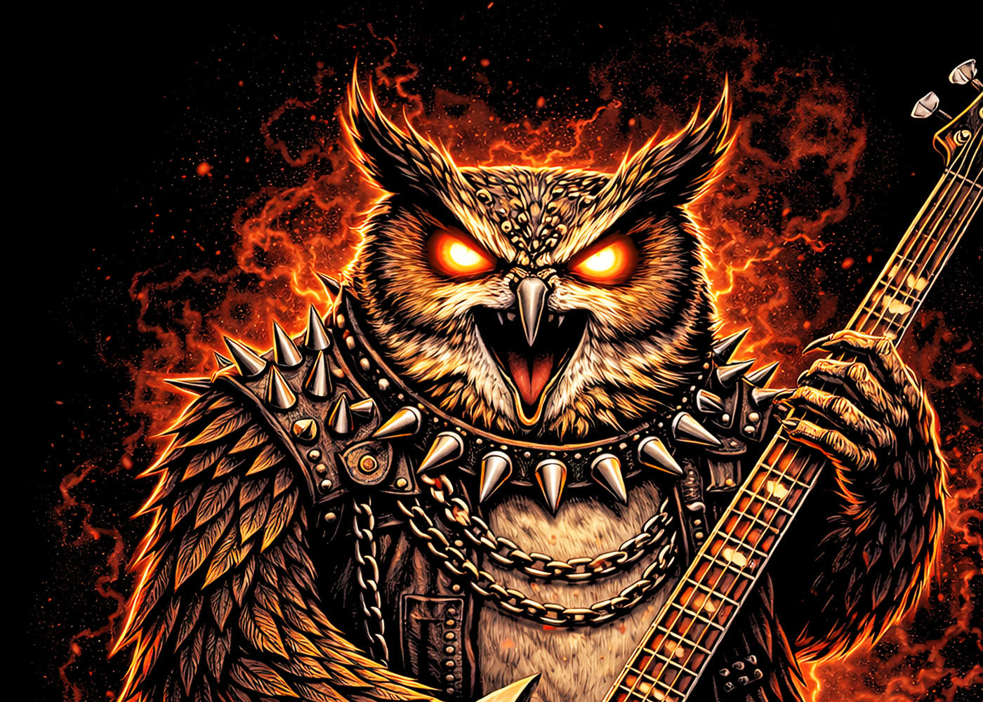 Spiked armor and blazing riffs transform this bird of prey into a full-fledged metal rock owl, screaming defiance through strings and steel. Perfect for fans of animal rock art, gothic music imagery, and creatures that turn darkness into sound and fire into rhythm.