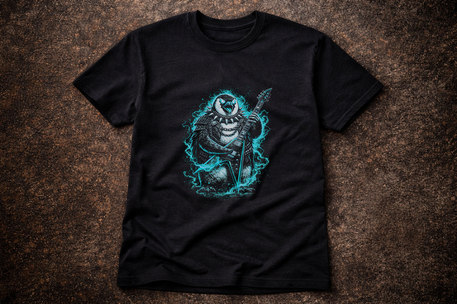 This design unleashes a metalhead penguin, a fierce anthropomorphic bird reborn as a rock guitarist from the frozen abyss. Clad in spiked leather and chains, this punk penguin musician grips an electric guitar as crackling blue energy surges around its feathers. Equal parts animal totem and heavy metal icon, it’s a savage fusion of penguin warrior, rock star, and dark fantasy creature.