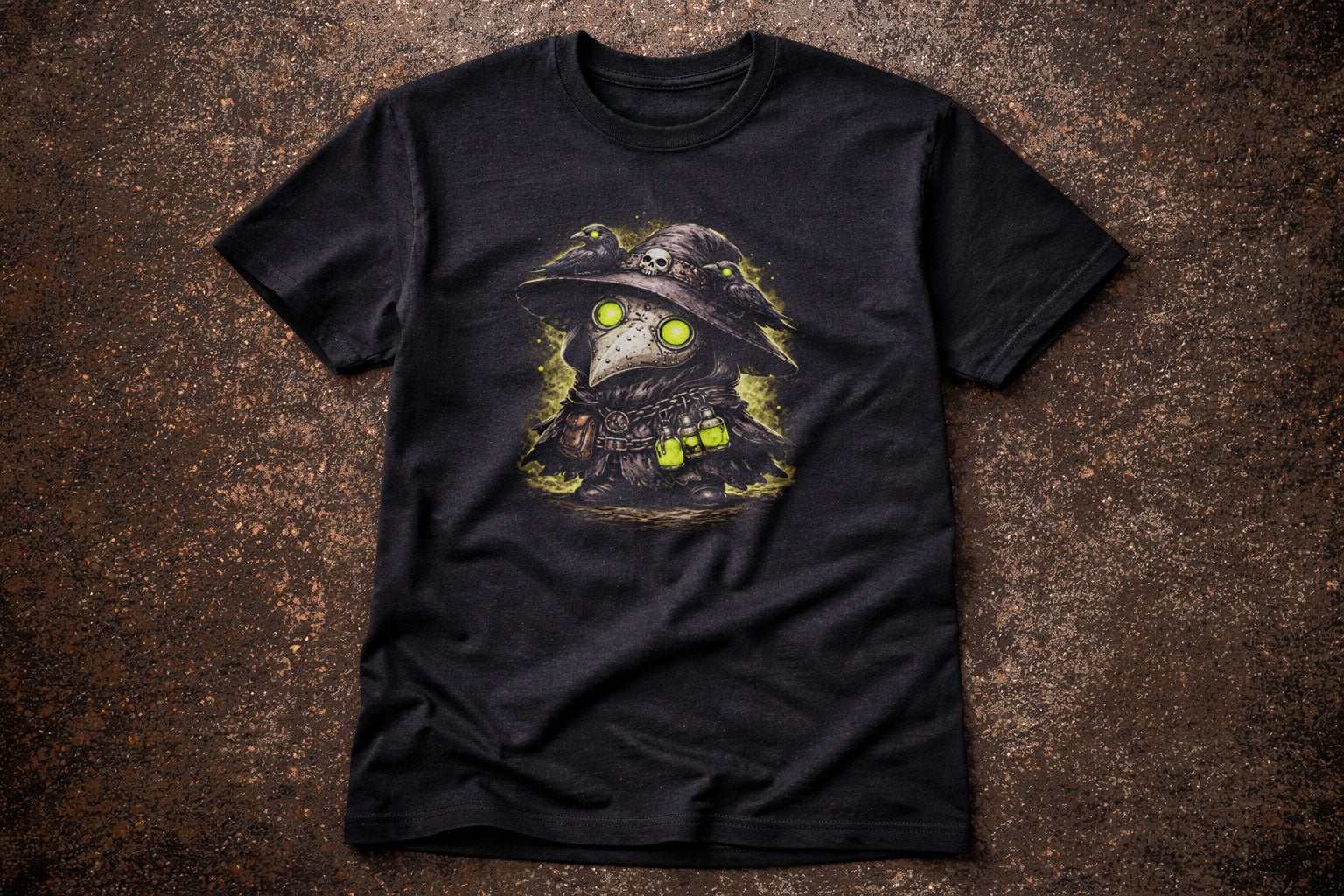 This design features a sinister plague gnome, blending dark fantasy with medieval horror aesthetics. Wearing a weathered plague-doctor mask with glowing green lenses, the gnome radiates toxic mysticism. Glass vials of luminous poison hang from his belt, while black ravens perch atop his wide-brimmed hat, reinforcing themes of death, alchemy, and disease. The green glow and grim detailing give this alchemist gnome an unsettling presence, evoking cursed apothecaries and forbidden remedies. Perfect for fans of plague doctor art, creepy gnome designs, and gothic fantasy apparel with a macabre edge.
