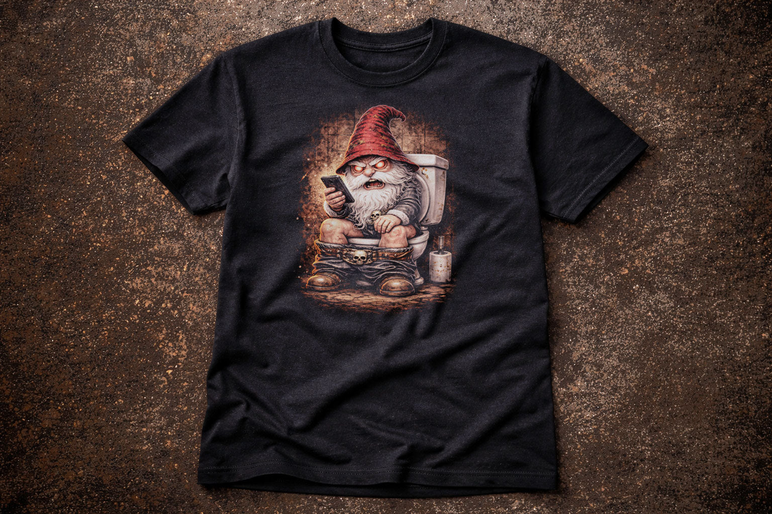This design showcases a crude, dark-humor gnome caught in a very modern and unapologetically irreverent moment. The furious red-hatted gnome sits on a toilet, pants down, doom-scrolling on his phone, glowing eyes blazing with pure rage and impatience. Grim dungeon textures, skull accents, and gritty lighting give it a metal fantasy twist, turning bathroom humor into something aggressively bold and comedic.
