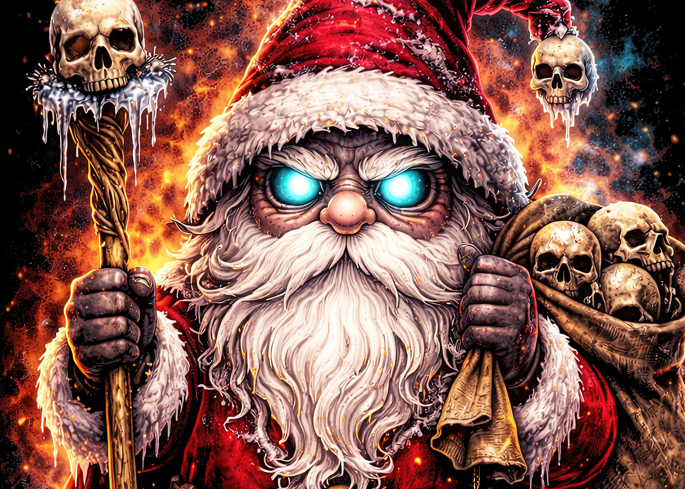 This design features a dark metal Santa gnome reimagined as a fearsome, occult gift-bringer. Clad in a tattered red Santa coat with glowing blue eyes, he grips a skull-topped staff and carries a sack overflowing with skulls instead of presents. Flames and embers surround him, blending Christmas imagery with sinister fantasy aesthetics.