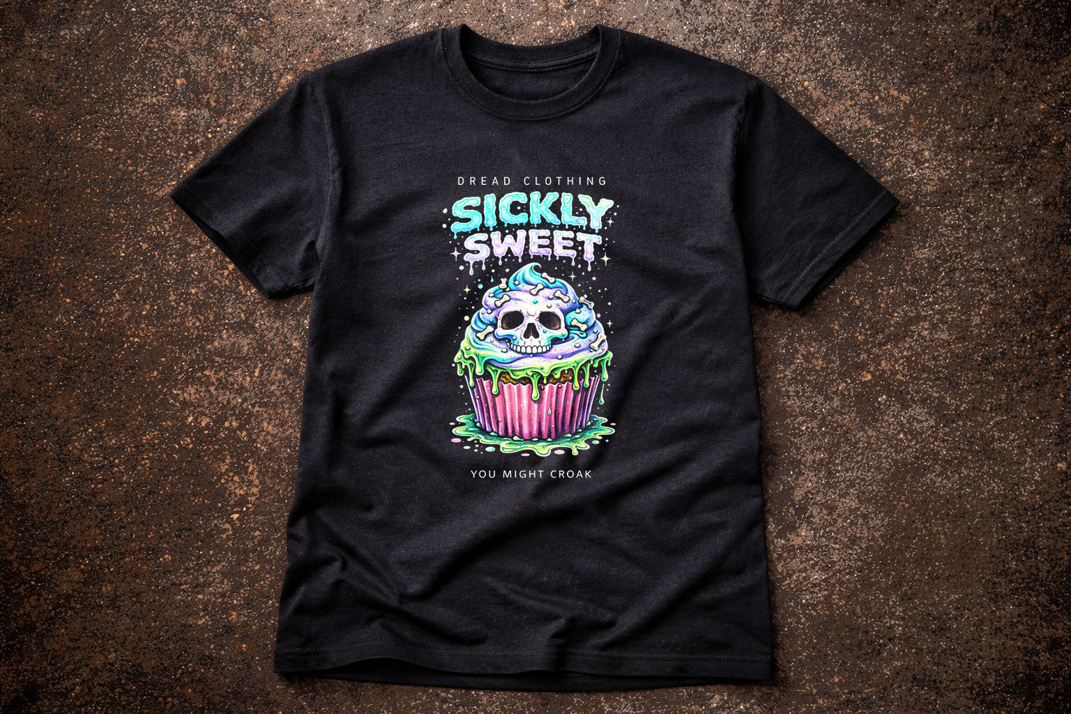 Sugar rots best in the dark. The Sickly Sweet tee serves a pastel nightmare—an innocent cupcake crowned with a grinning skull, frosting melting into neon poison below. Candy colours clash with gothic dread, turning dessert into a delicious threat you shouldn’t trust. It’s playful, grotesque, and unapologetically toxic, balancing cute aesthetics with a fatal wink of humour. Every drip feels dangerous, every smile a warning. Perfect for lovers of dark irony, horror sweets, and twisted pop art, this design tempts fate and appetite alike. Go on—take a bite. Just don’t say you weren’t warned.