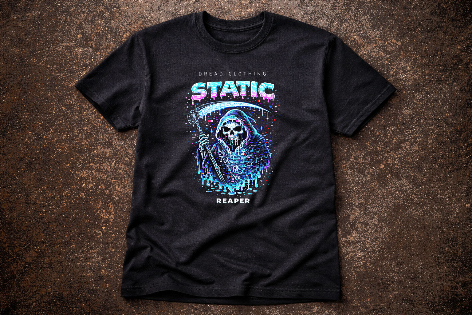 Death breaks through the signal, fractured and flickering. The Reaper emerges in neon blues and corrupted pixels, scythe slicing through static as reality tears and distorts. Digital noise melts into toxic glow, as if the afterlife itself is glitching. “Static Reaper” captures the moment the screen goes wrong and something looks back. The black fabric becomes an endless void, amplifying every cyber-gothic detail and spectral shimmer. Dark, modern, and unnervingly sharp, this design feels like wearing a corrupted transmission from the other side.
