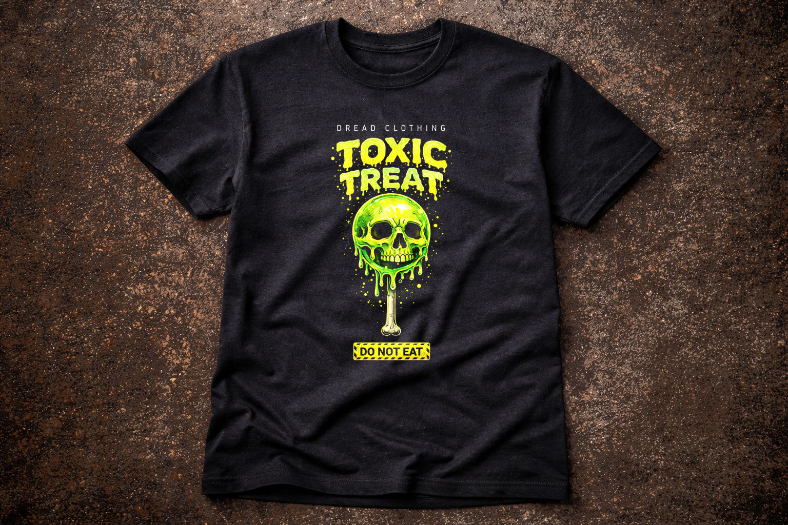 Indulge at your own risk with the Toxic Treat t-shirt—a warning wrapped in neon poison. This dripping green skull lollipop oozes radioactive sweetness, glowing like a forbidden prize from a nightmare sweet shop. Equal parts playful and lethal, it blends candy-coated colour with gothic menace and dark humour. The bold toxic palette pops against black, making it impossible to ignore and hard to forget. Perfect for fans of horror art, creepy-cute aesthetics, and alt streetwear with bite, this design whispers temptation while screaming danger. Sweet, sinister, and beautifully toxic—definitely not for the faint-hearted.