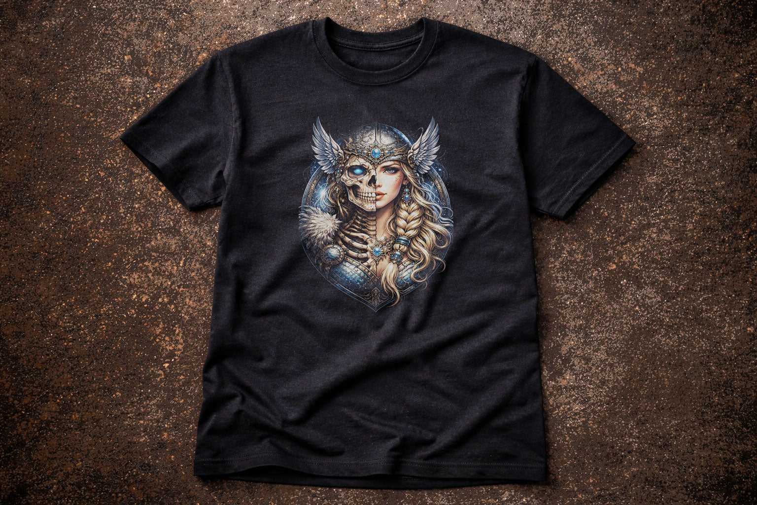 A Norse shieldmaiden rises here as an undead Valkyrie, half warrior woman, half skeleton, crowned in steel and feathers. This design portrays a Viking maiden bound to death and honour, her braided hair and battle armour giving way to exposed bone and a single glowing eye. She feels eternal — chosen by the gods, walking the line between Valhalla and the grave. There is strength, beauty, and quiet menace in her stare, as if she has carried fallen souls across battlefields for centuries. Rich in Nordic mythology and gothic fantasy, this shirt is made for lovers of Viking lore, skeletal art, and warrior symbolism. Wear it as a tribute to strength beyond death, where courage never rots and legends refuse to fade.