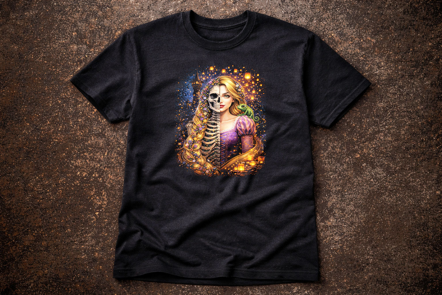 This Rapunzel gothic t shirt features a dark fantasy reimagining of the classic fairy tale. The artwork shows a striking half-skeleton, half-human figure with flowing golden hair entwined with flowers, glowing lanterns, and warm magical light. Rich purples and golds contrast against the black shirt, creating a dramatic and detailed fantasy illustration with a gothic edge. Perfect for fans of dark fairy tales, fantasy art, alternative fashion, and unique graphic tees. Printed on a black unisex t shirt, this design makes a bold statement while blending beauty, darkness, and storybook magic.