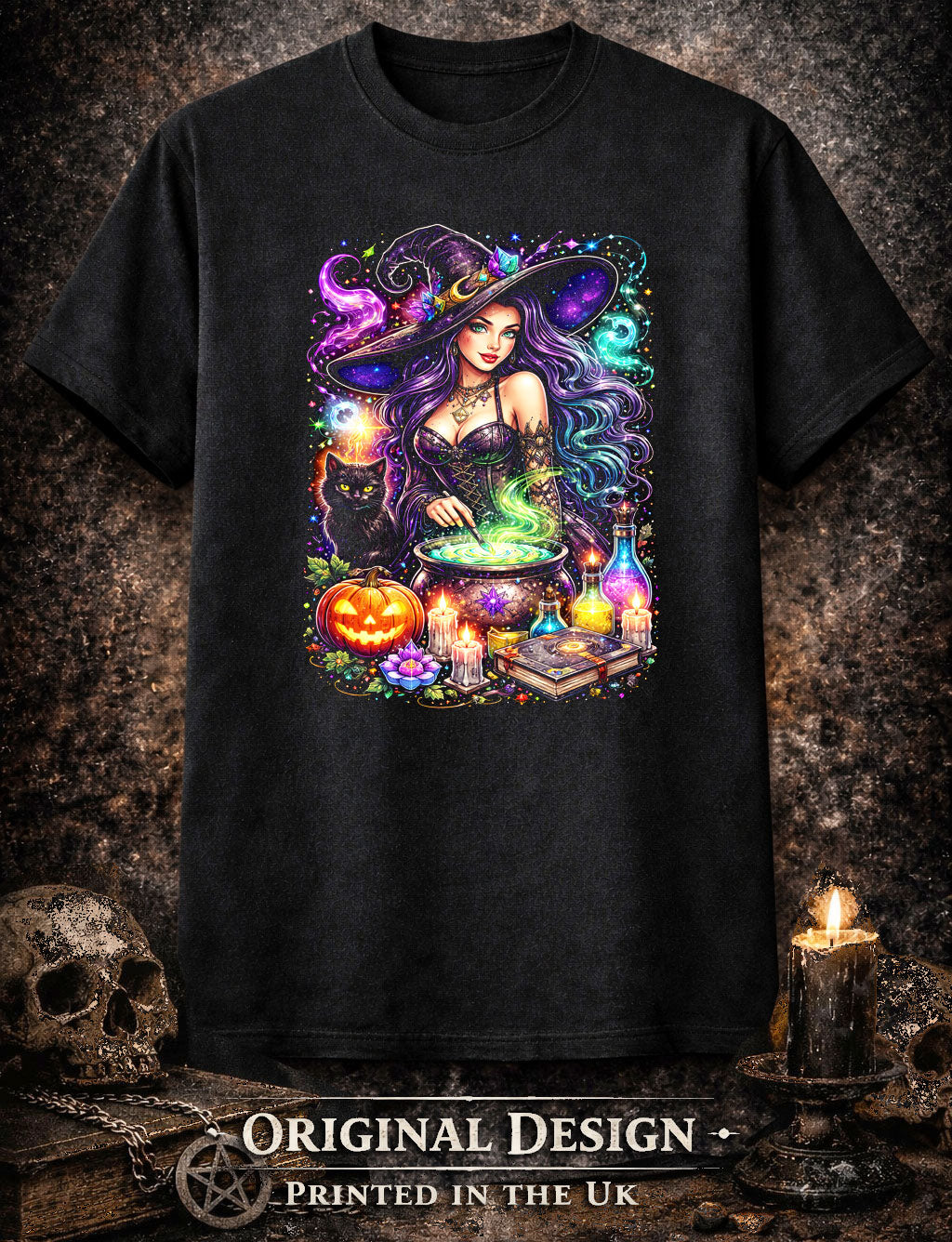 A spell mid-brew, caught in glowing detail. This design conjures a midnight witch stirring her cauldron as neon magic coils through the air, lighting candles, crystals, and forbidden pages. Her gaze is calm, knowing—power held effortlessly beneath velvet shadows. Psychedelic color ignites the scene, turning ritual into spectacle, while a gothic hush lingers beneath the glow. Pumpkins grin, potions shimmer, and a watchful familiar waits in silence. This shirt feels like standing inside a spell circle, where beauty and danger coexist. Wear it as a charm for moonlit nights, restless souls, and those who know true magic thrives in the dark.