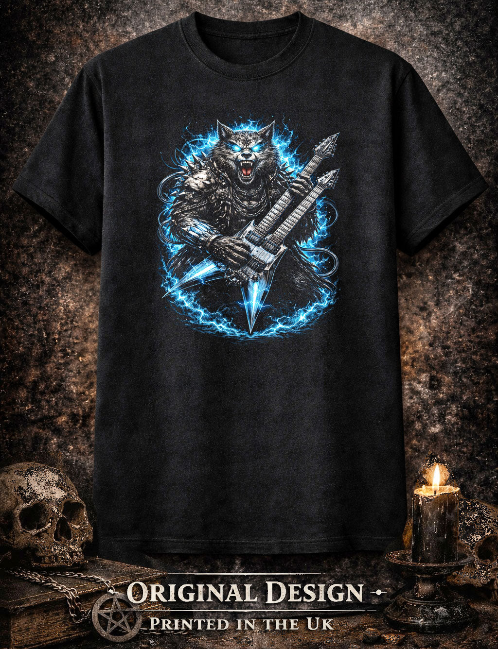 This design roars to life as a werewolf rock guitarist, a savage anthropomorphic wolf fused with heavy metal fury. Snarling jaws and glowing blue eyes erupt from a storm of crackling energy as this wolf warrior musician shreds a double-neck electric guitar like a weapon. Part lycanthrope, part metal god, it captures the raw power of a werewolf unleashed under a full moon, channeling rage through strings and steel. Spiked armor, lightning, and feral motion turn this creature into a living anthem of rebellion. Dark fantasy meets rock mythology in a shirt made for fans of werewolves, wolf art, and unapologetically loud gothic music culture.